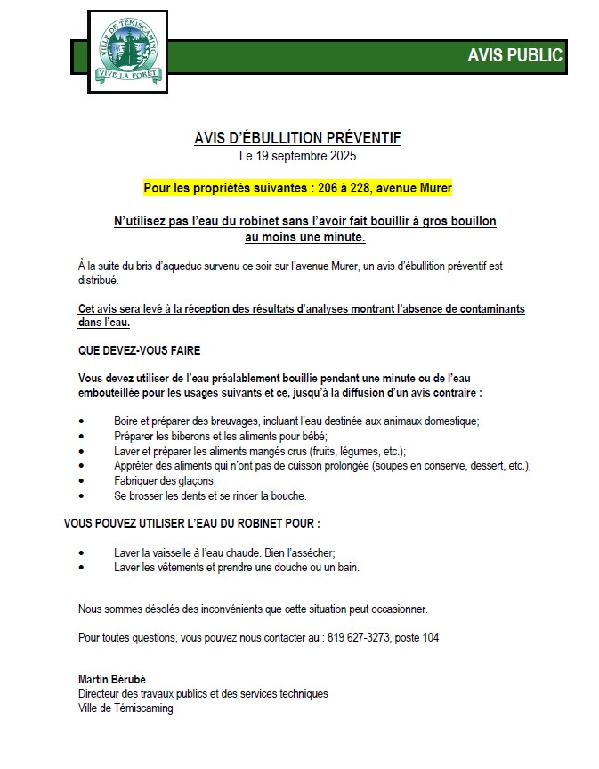 Cette alerte est en lien avec la levée d'alerte suivante : LEVÉE DE L'AVIS D'ÉBULLITION PRÉVENTIF., publié le mardi 7 octobre 2025 à 13 h 43.