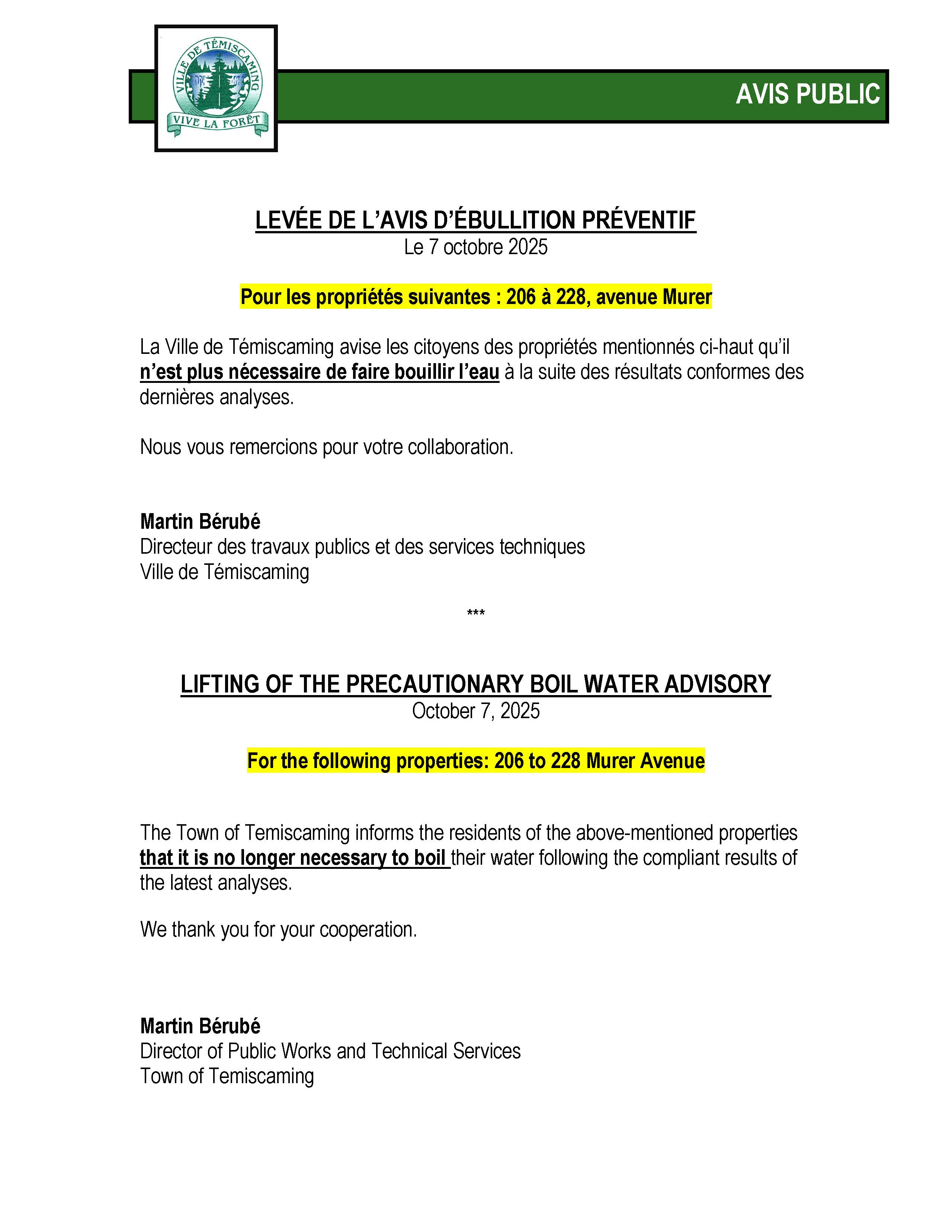 LEVÉE DE L'AVIS D'ÉBULLITION PRÉVENTIF.