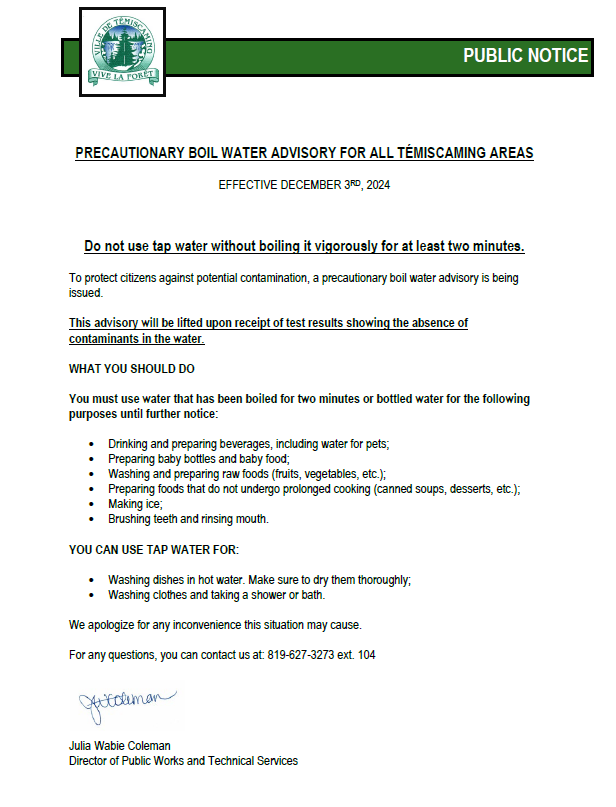 (Alert raised) PREVENTIVE BOIL WATER ADVISORY FOR ALL SECTORS OF TEMISCAMING