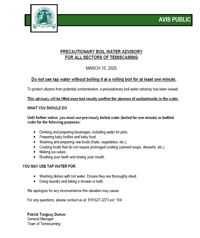 (Alert raised) PRECAUTIONARY BOIL WATER ADVISORY - ALL SECTORS OF TEMISCAMING