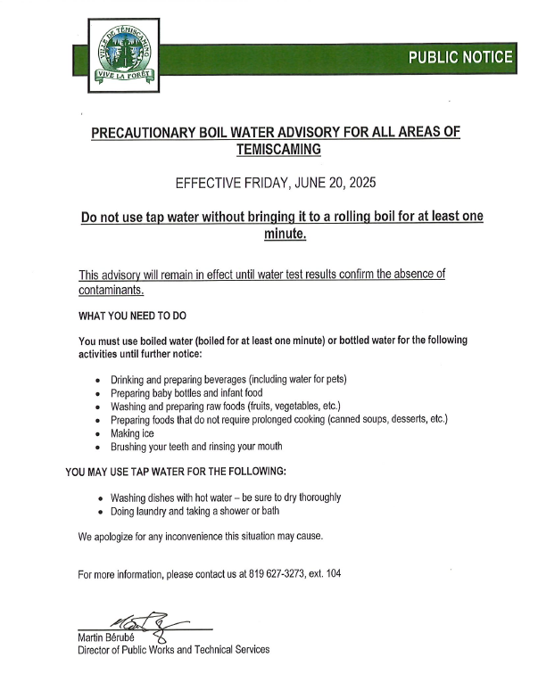 (Alert raised) PRECAUTIONARY BOIL WATER ADVISORY FOR ALL AREAS OF TEMISCAMING