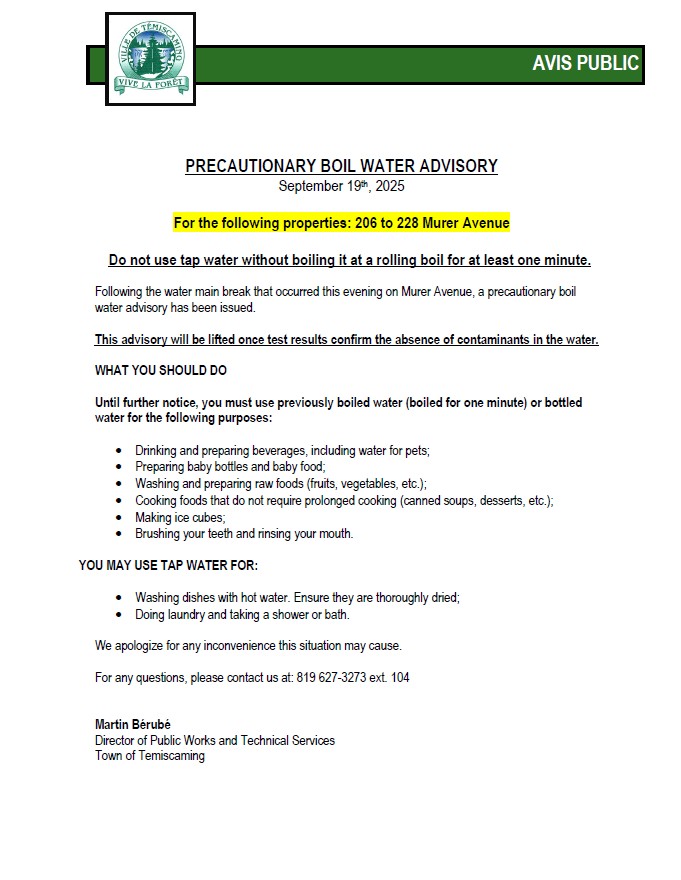 This alert is related to the following alert: LIFTING OF THE PRECAUTIONARY BOIL WATER ADVISORY., published on mardi 7 octobre 2025 to 13:43.